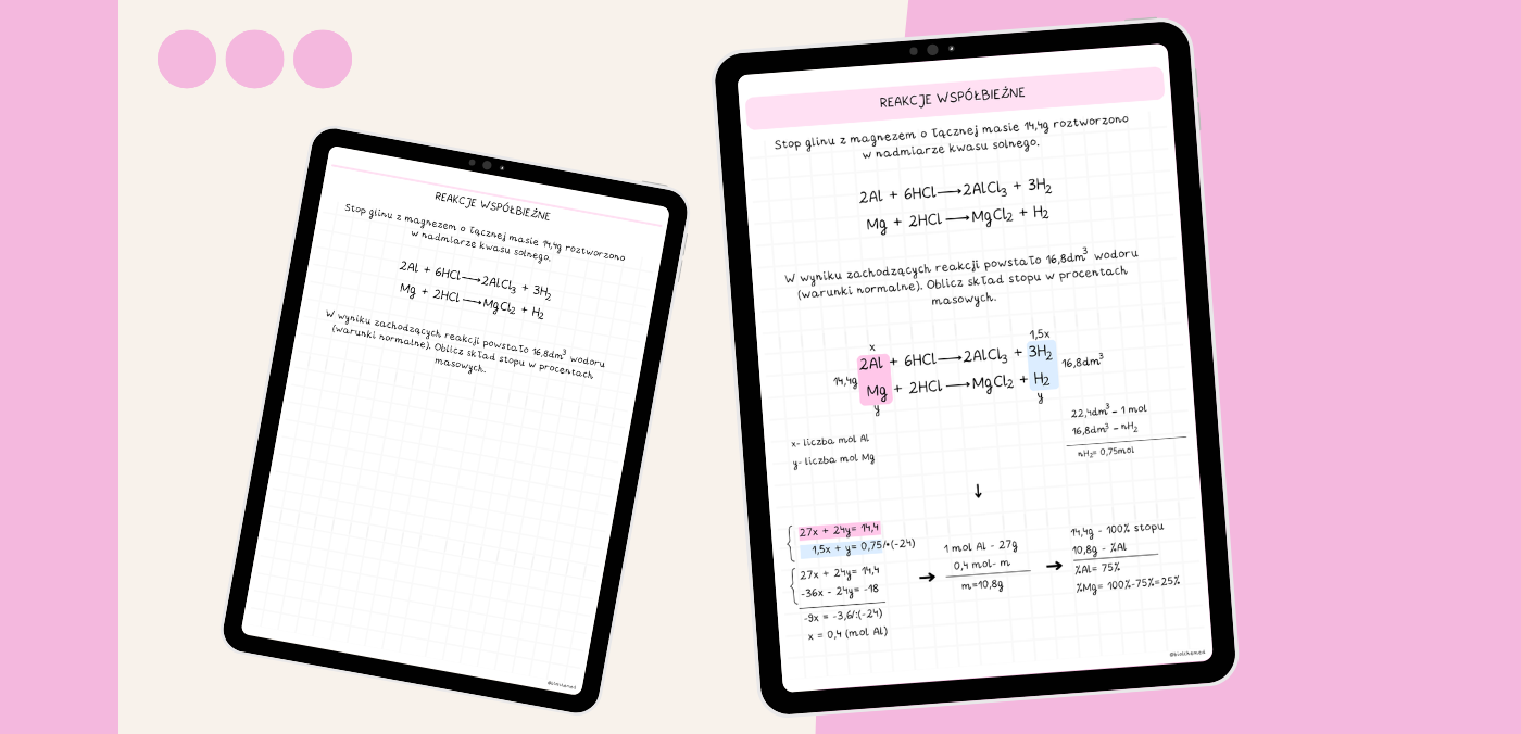 Ta część notatek to ,,samouczek" obliczeń chemicznych, w którym pokazuję Ci jak ogarnąć je od podstaw (takich jak np. przeliczanie liczby moli na masę, objętość itd.) aż do trudniejszych zagadnień, gdzie musisz połączyć wiele umiejętności (np. zadania z przerywaniem mieszaniny po ogrzaniu, reakcje współbieżne, zadania z hydratów i wiele, wiele innych).